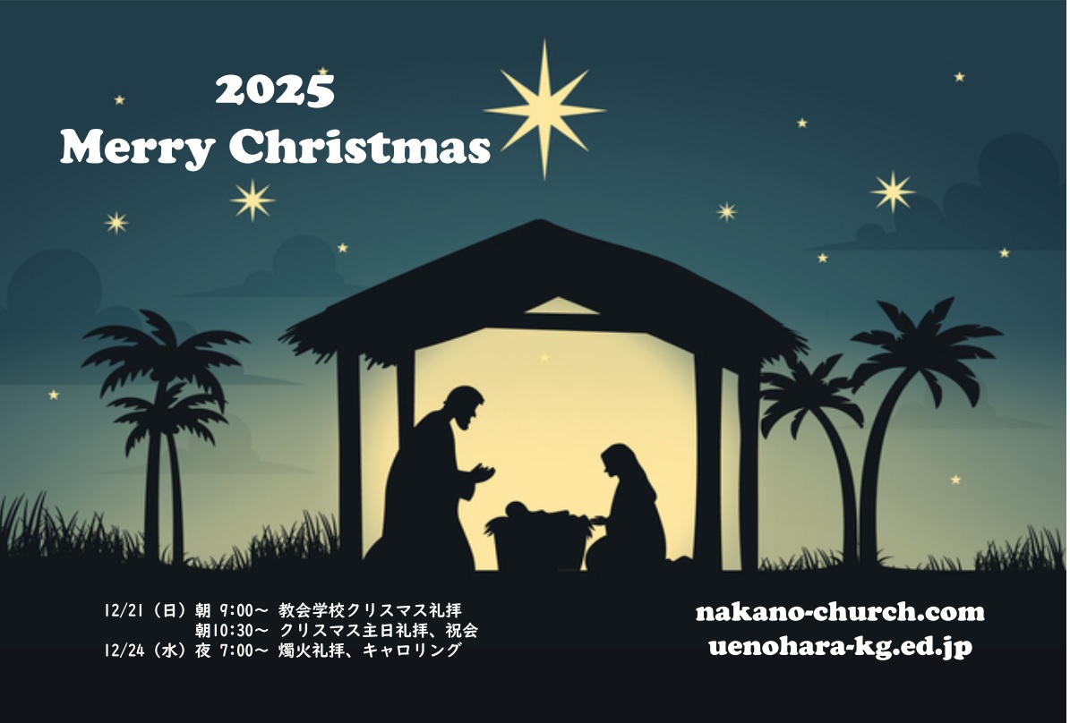 未分類 2025クリスマスのご案内 2025年12月1日 saeru 2025 年の主なクリスマス行事は以下の通りです。・教会学校クリスマス礼拝:12 月21 日(日) 朝9 時・クリスマス主日礼拝:12 月21 日(日) 朝10 時半・クリスマス祝会:12 月21 日(日) 朝礼拝後・燭火礼拝:12 月24 日(火) 夜7 時※その他にもクリスマス諸集会を計画しております。 Tweet